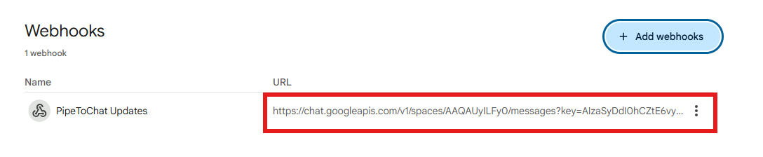 A webhook is a technical interface that allows one application to talk to another. In this case, there is a webhook in PipeToChat that accepts updates from Pipedrive, and another one on Google Chat that accepts updates from PipeToChat